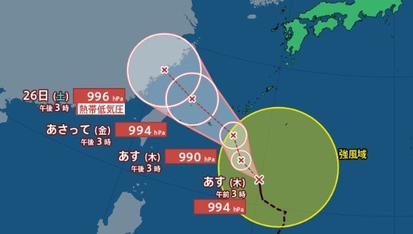 ▼48時間後の25日午後3時には、東シナ海の半径210キロの円内に達する見込みです。中心の気圧は994ヘクトパスカル、最大風速は18メートル、