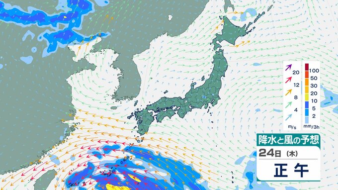 ニュースクリップ 【ダブル台風】台風7号 25日にかけ沖縄に接近する見込み 1時間に約20キロの速さで西へ進む 26日には熱帯低気圧に変わる見込み【雨風シミュレーション】 2025年7月24日(木) 10:15 国内 天気 24日(木)の雨と風のシミュレーション