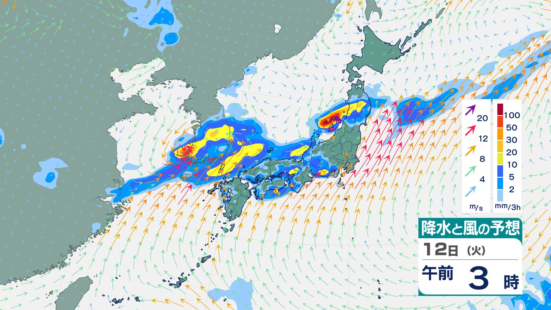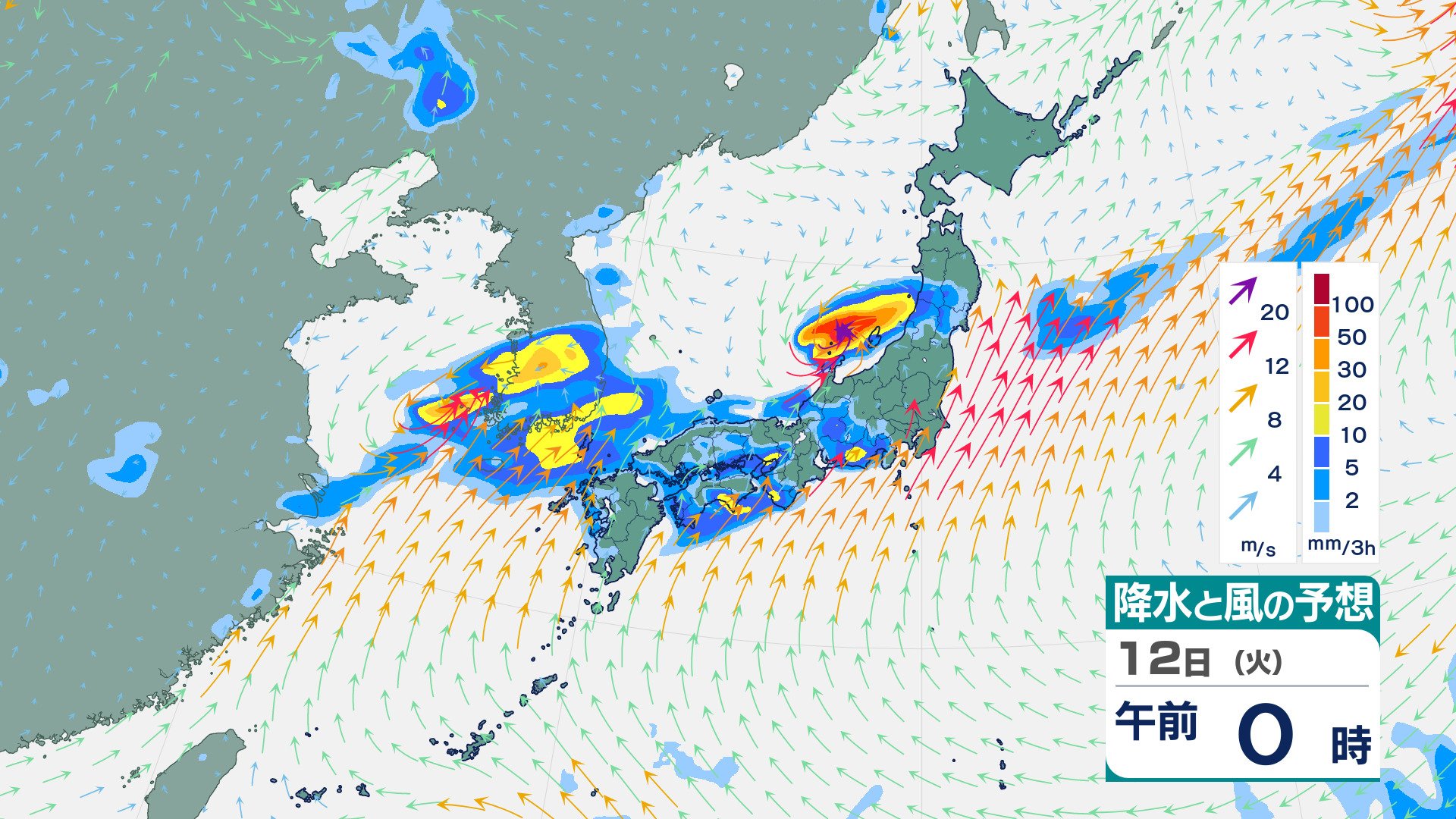 ニュースクリップ 【大雨情報】九州北部地方は11日にかけて大雨となるおそれ 線状降水帯が発生して大雨災害発生の危険度が急激に高まる可能性 10日夕方までに予想される24時間降水量:山口300ミリ 福岡250ミリ 佐賀250ミリ 長崎250ミリ 大分200ミリ 熊本150ミリ【雨風シミュレーション】 2025年8月9日(土) 18:00 国内 天気 12日(火)の雨風シミュレーション