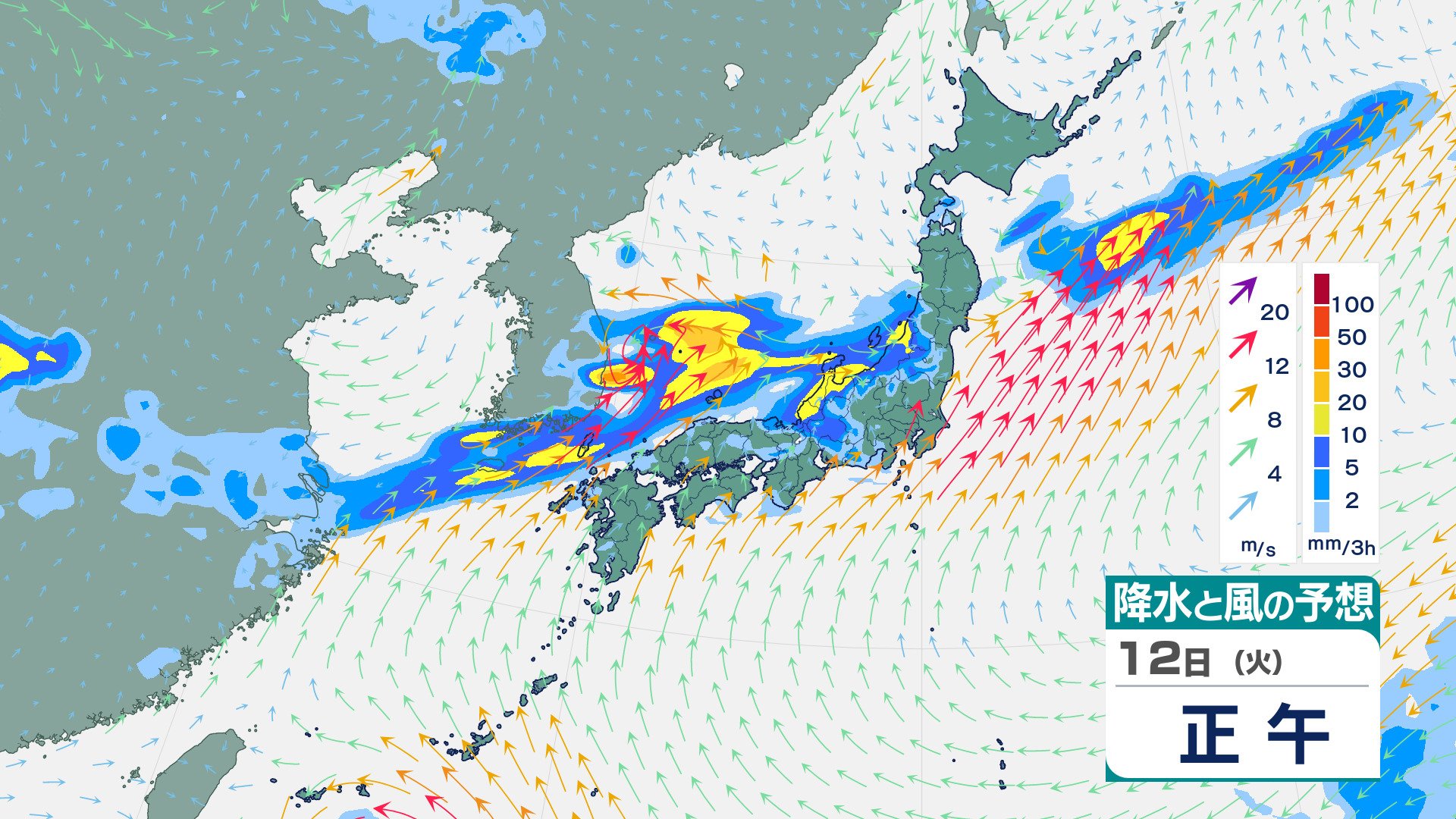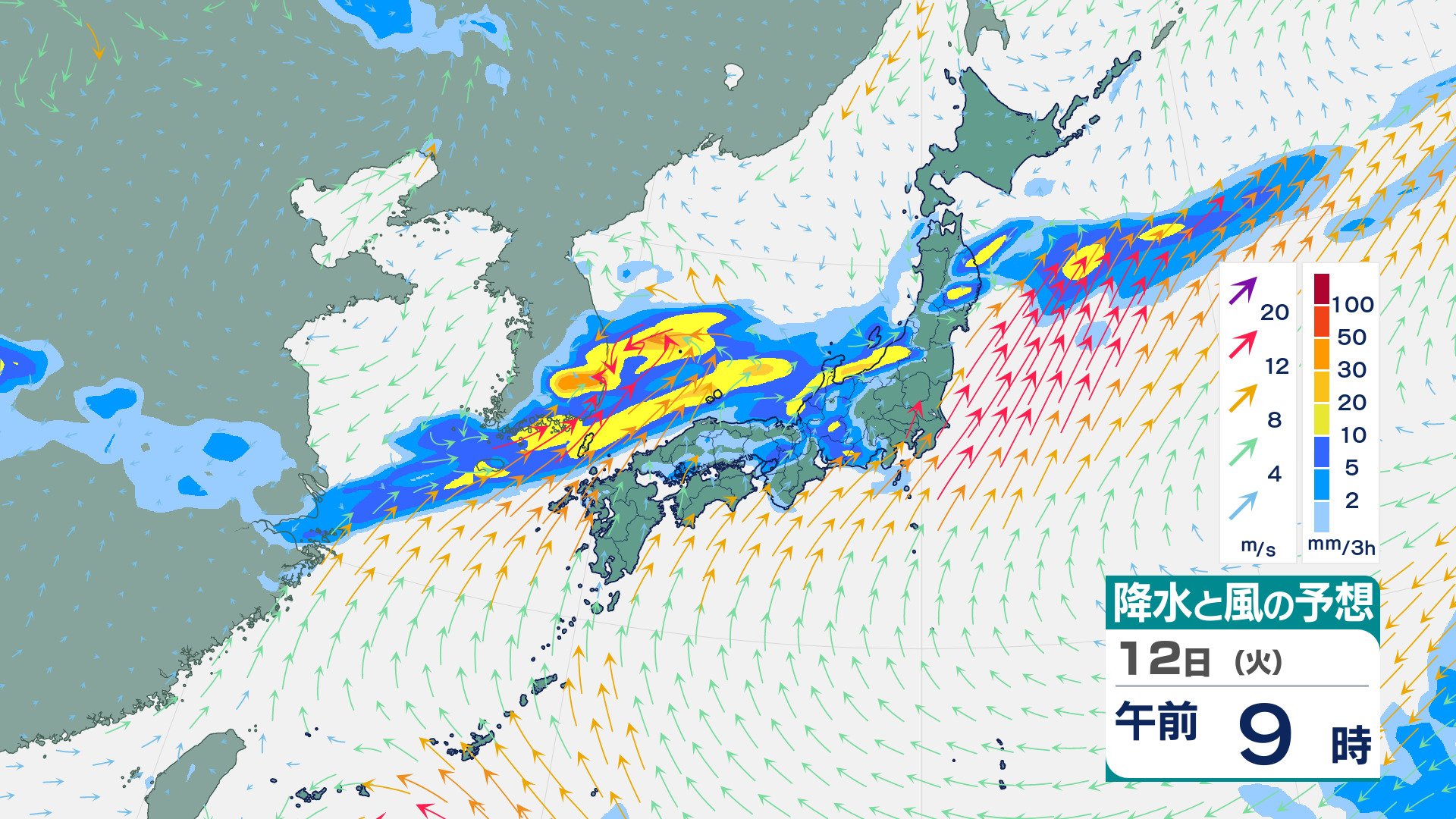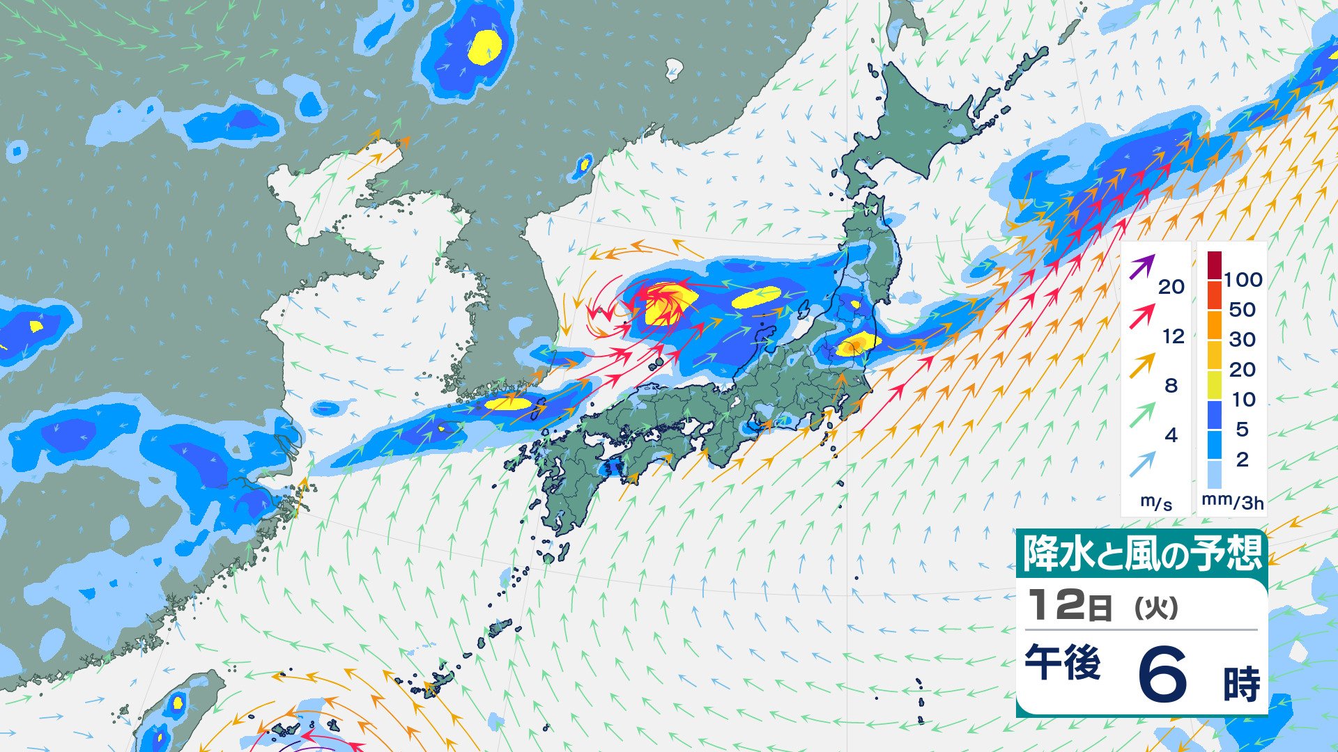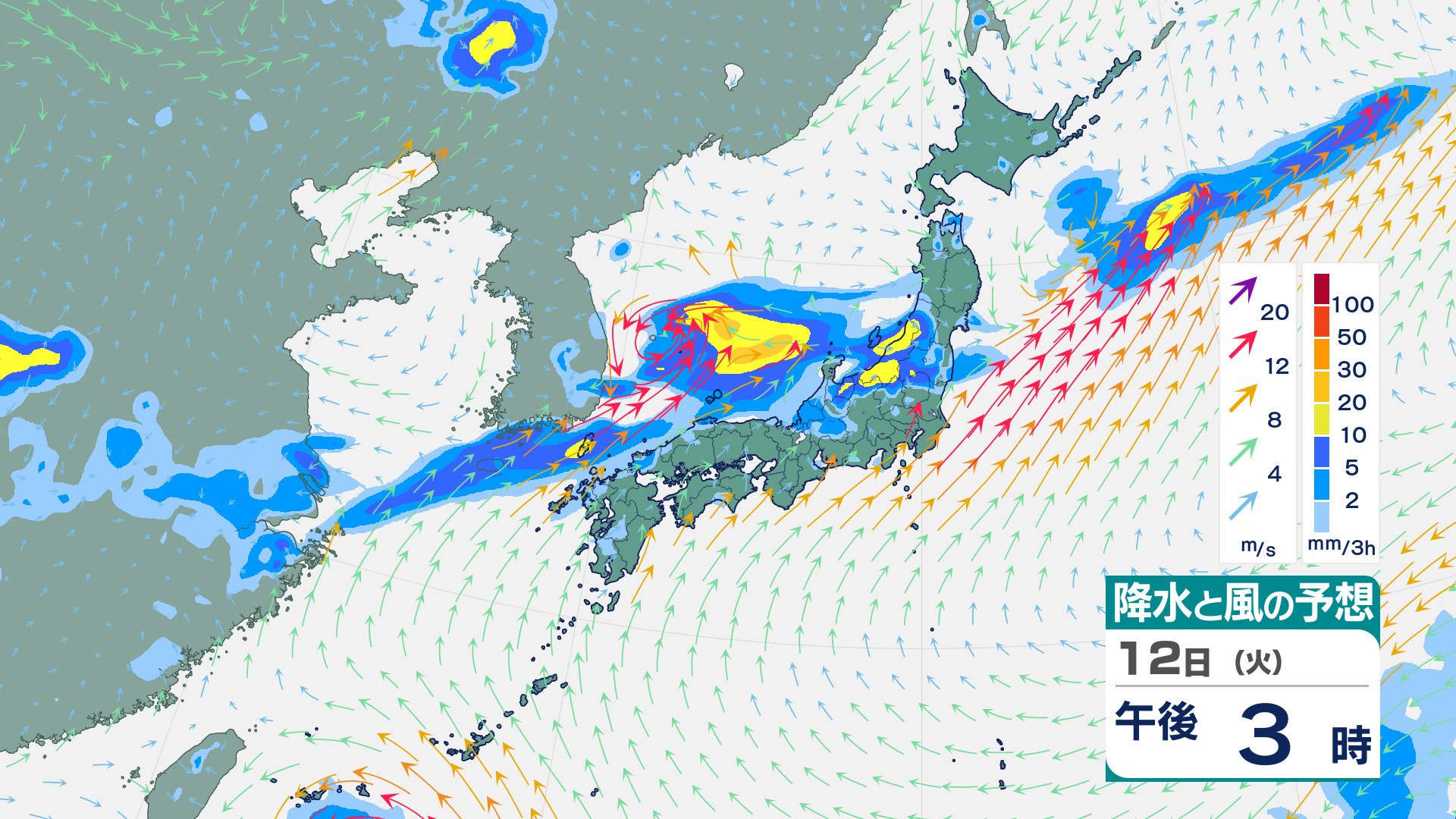ニュースクリップ 【大雨情報】関東甲信地方は10日昼前から雷を伴った激しい雨、12日にかけて大雨となるおそれ 警報級の大雨となる可能性も 土砂災害や低い土地の浸水、河川の増水に注意・警戒【雨風シミュレーション】 2025年8月10日(日) 06:22 国内 天気 12日(火)の雨風シミュレーション