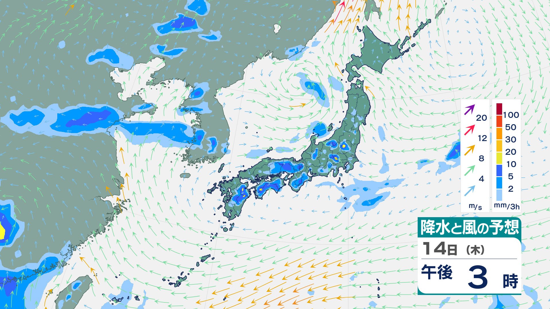 ニュースクリップ 福岡県で線状降水帯が発生…命に危険が及ぶ土砂災害や水害の危険度が急激に高まるおそれ 11日正午までに多いところで250mmの降雨予想【雨風シミュレーション】 2025年8月10日(日) 12:59 国内 天気 14日(木)の雨風シミュレーション