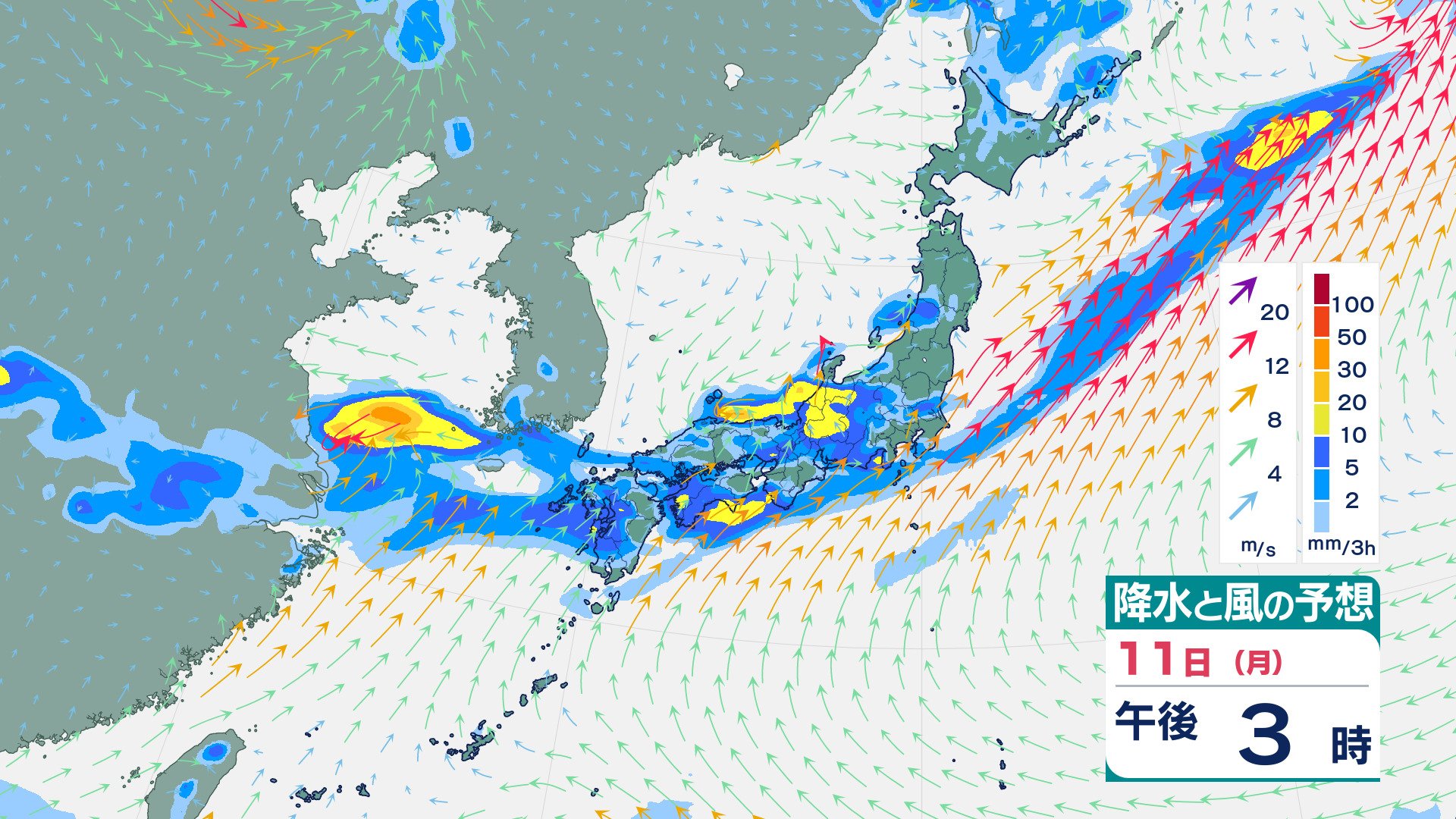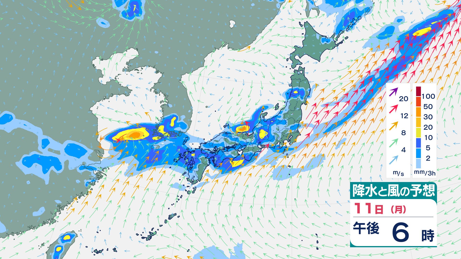 ニュースクリップ 前線上の低気圧が引き起こす「記録的大雨」北日本から西日本にかけて12日まで大雨が続く見込み 九州北部で線状降水帯の危険性、週半ばからは一転35度の猛暑に【雨風シミュレーション】 2025年8月10日(日) 14:00 国内 天気 11日(月)の雨風シミュレーション