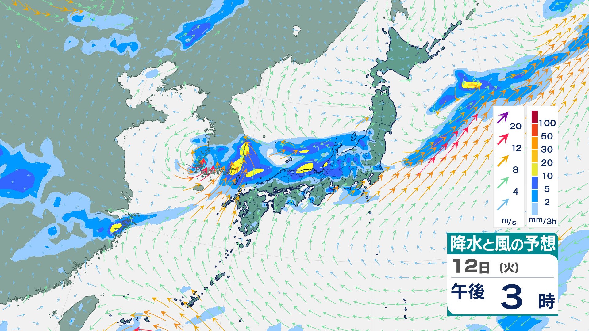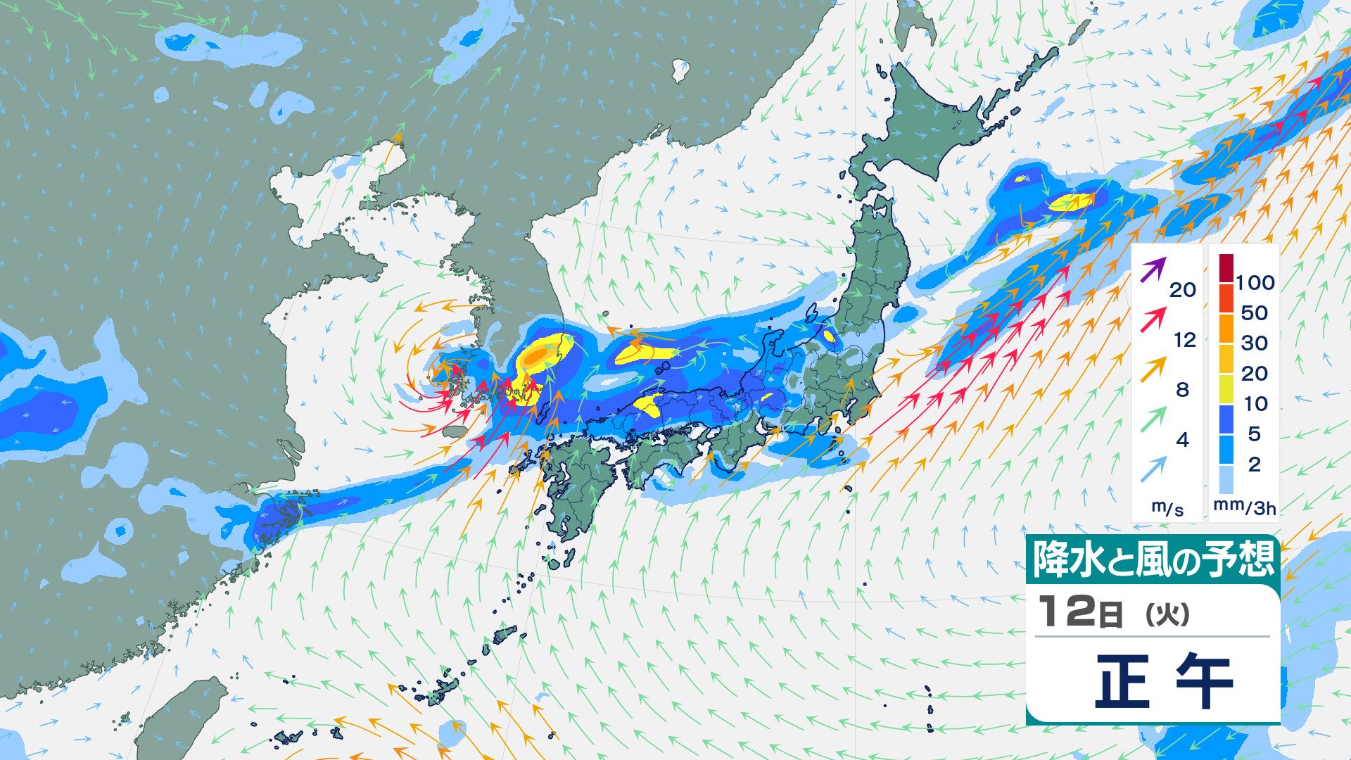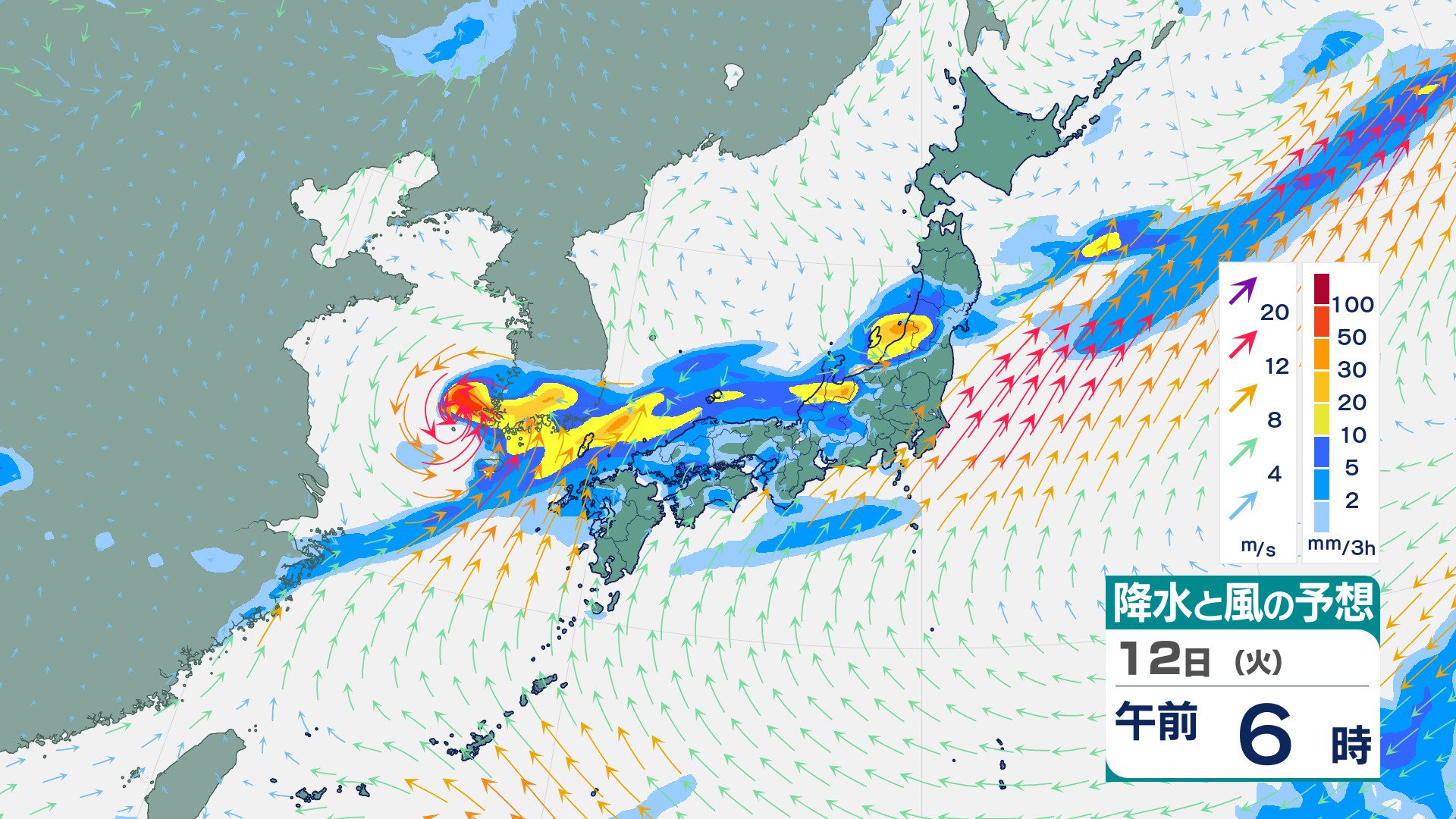 ニュースクリップ 【大雨情報】関東甲信地方は、12日にかけて断続的に雷を伴った激しい雨が降り大雨となる所がある見込み 少ない雨量でも大雨災害の危険度が高まるおそれ『警報級の大雨』の可能性も【雨風シミュレーション】 2025年8月10日(日) 17:03 国内 天気 12日(火)の雨風シミュレーション