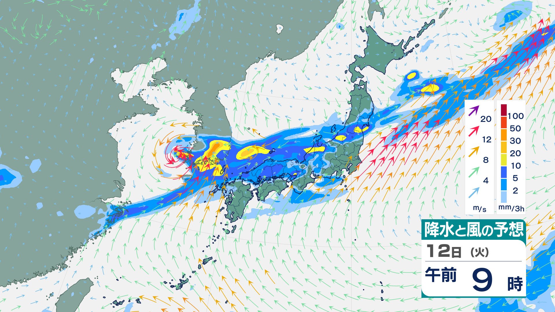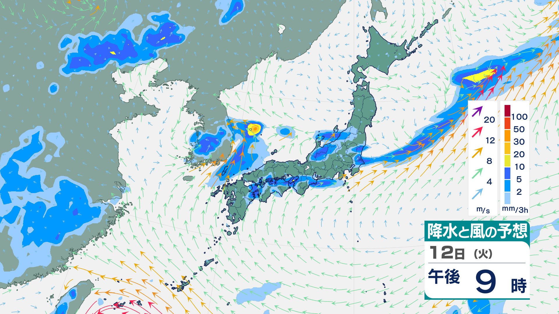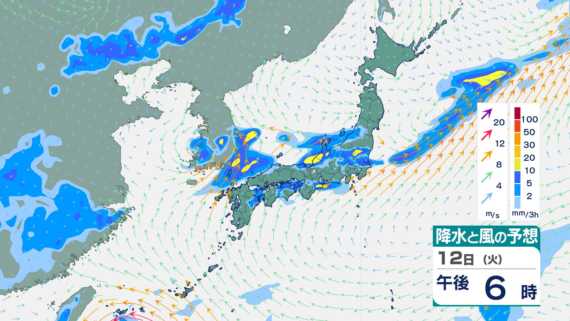 ニュースクリップ 【大雨情報】関東甲信地方は、12日にかけて断続的に雷を伴った激しい雨が降り大雨となる所がある見込み 少ない雨量でも大雨災害の危険度が高まるおそれ『警報級の大雨』の可能性も【雨風シミュレーション】 2025年8月10日(日) 17:03 国内 天気 12日(火)の雨風シミュレーション