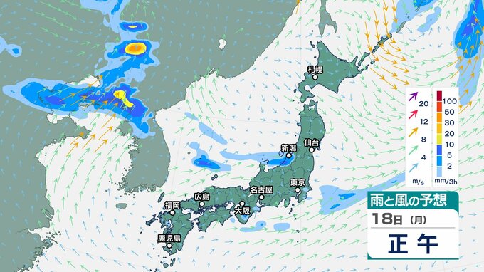 ニュースクリップ 【大雨情報】関東甲信は、18日昼過ぎから夜遅くにかけて1時間50ミリの非常に激しい雨の降る所も…警報級の大雨となる可能性【雨と風のシミュレーション】 2025年8月18日(月) 14:28 国内 天気 18日(月)の雨風シミュレーション