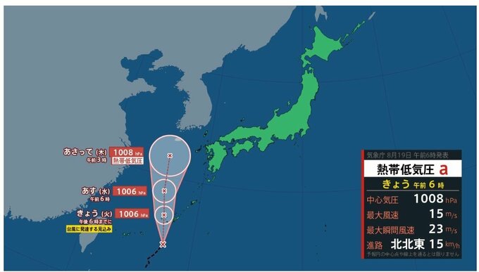 熱帯低気圧は今後12時間以内に台風となる見込みで、19日は沖縄地方に接近し、その後、東シナ海を北上する見込みです。また、20日にかけて、熱帯低気圧や台風に流れ込む暖かく湿った空気の影響で、大気の状態が非常に不安定となる見込みです。