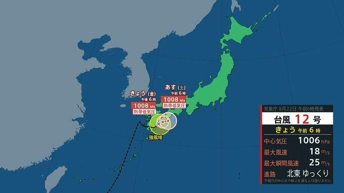 台風12号は、日向灘を北東へ進み、22日昼過ぎまでに熱帯低気圧に変わるでしょう。
