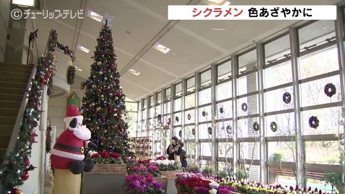 砺波市にある富山県花総合センターでは、高さ5メートルのクリスマスツリーの周りに色鮮やかなシクラメンの鉢植えが並べられました。