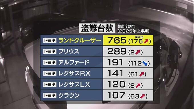 警察庁の今年上半期のデータでは、特に「ランドクルーザー」や「クラウン」、「レクサスRX」など、トヨタ自動車の人気モデルの盗難台数が去年と比べて大幅に増加しています。