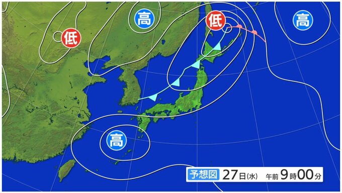 上空の高気圧は、27日にかけて日本のはるか東に中心を移します。また、28日は、別の上空の高気圧が黄海付近から本州付近に張り出します。地上では、日本の南の高気圧は、27日にかけて東シナ海に中心を移し、その後停滞します。