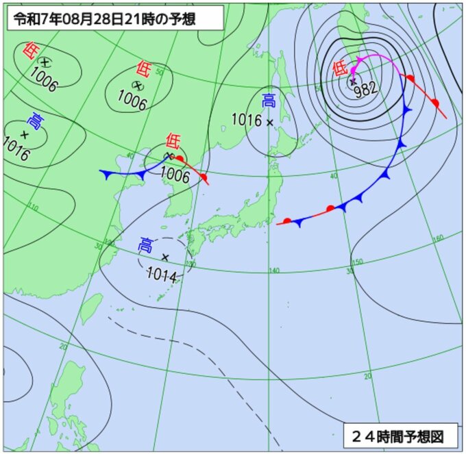 東シナ海にほとんど停滞している高気圧は、29日にかけてもその位置をほとんど変えない見込みです。29日から30日にかけては、5940m以上の高気圧が本州付近で顕在化して停滞し、地上でも日本の東から日本の南に高気圧が顕在化します。