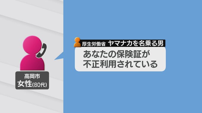 高岡警察署によりますと、6月18日、高岡市に住む80代の女性の自宅の固定電話に厚生労働省のヤマナカを名乗る男から「あなたの保険証が不正利用されている」と電話がありました。