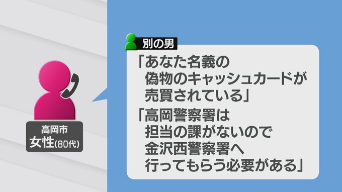 その後、別の男に電話が代わり「あなた名義の偽物のキャッシュカードが売買されている」「高岡警察署は担当の課がないので、石川県金沢西警察署へ行ってもらう必要がある」などと告げられました。