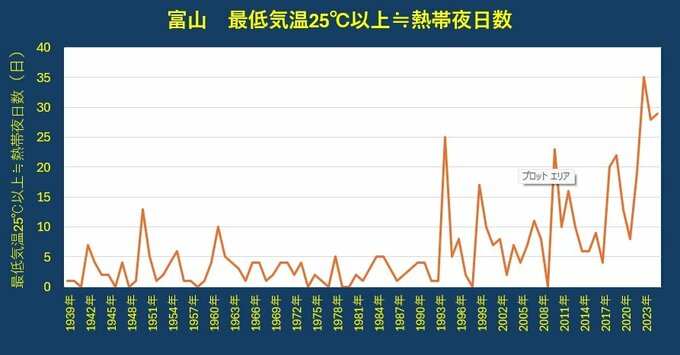 8月28日までの段階で、この夏(6~8月)の富山の平均気温は27.1度となり、2023年を上回って過去最も暑い夏となりました。最高気温が35度以上の猛暑日は23日を記録し、2023年の28日に次いで過去2番目の多さでした。また、日最低気温25℃以上(熱帯夜)の日数は29日で、こちらも2023年の35日に次ぐ過去2番目の多さとなっています。
