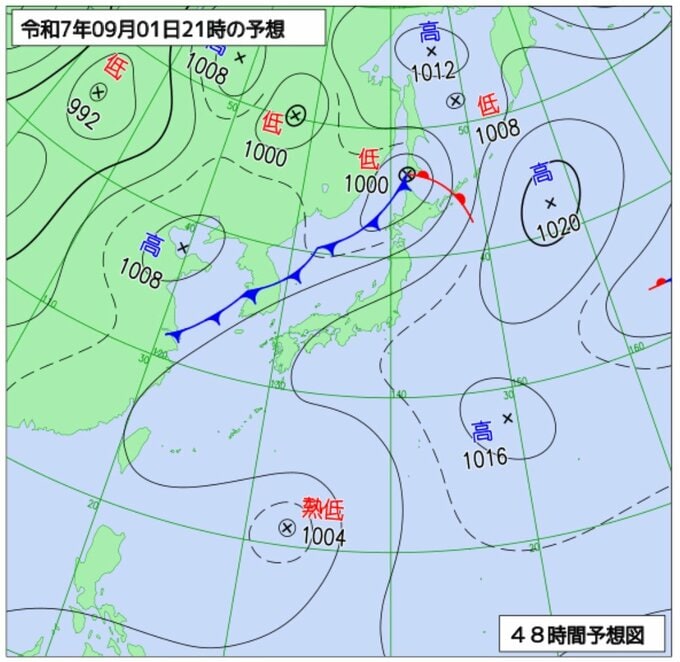 9月2日には、低気圧がオホーツク海から千島近海に進み、寒冷前線が北日本を南下します。