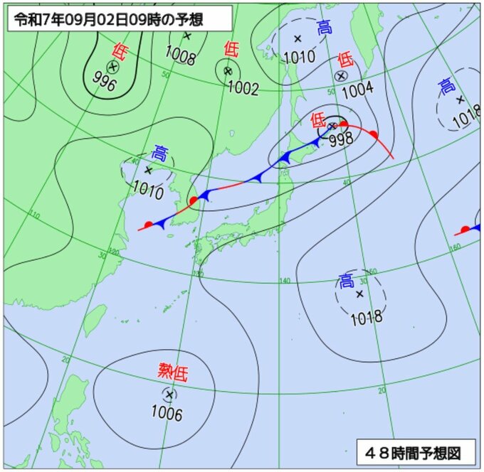 1日には温暖前線が北海道地方を北上し、2日には寒冷前線が北日本を南下する予想です。また、2日夜にかけて上空約5500メートル付近に寒気を伴う気圧の谷が日本海中部から北部へ進む見込みです。