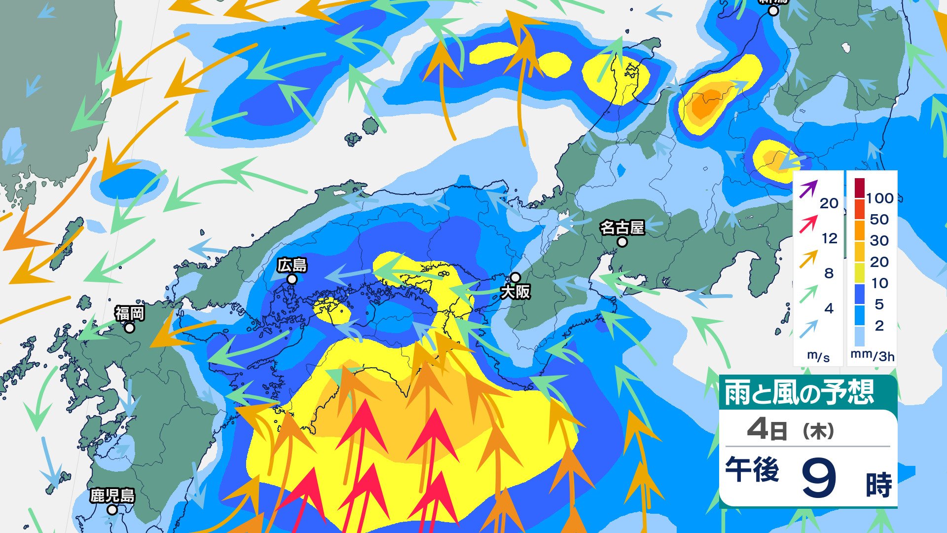 ニュースクリップ 【台風15号】中国地方には5日午前中に最接近の見込み 台風の進路によっては『警報級の大雨』となるおそれ 4日夜のはじめ頃~5日昼過ぎにかけて局地的に雷を伴った激しい雨が降るところも…【雨と風のシミュレーション】 2025年9月4日(木) 08:42 国内 天気 4日(木)雨と風のシミュレーション