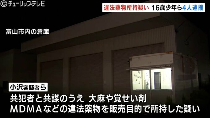 大麻などの違法薬物を販売目的で所持していた疑いで30日、16歳の少年を含むを含む男4人が逮捕されました。警察は富山県内を拠点に活動する密売グループとみて薬物の入手経路などを調べています。