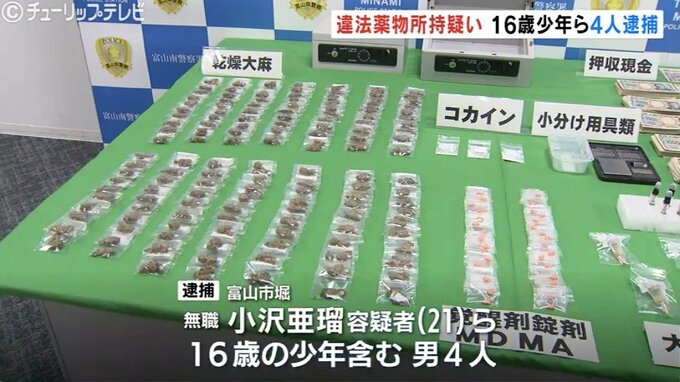 麻薬及び向精神薬取締法違反などの疑いで逮捕されたのは富山市堀の無職・小沢亜瑠容疑者(21)ら16歳の少年を含む男4人です。