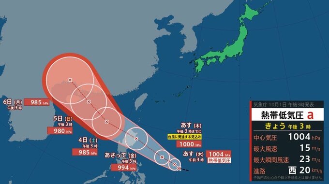 気象庁によりますと、この熱帯低気圧は1日正午現在、フィリピンの東の北緯14度30分、東経130度50分付近を西北西に時速20kmで進んでいます。中心気圧は1006hPa、中心付近の最大風速は15m/s、最大瞬間風速は23m/sとなっています。