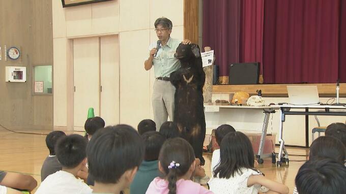 その後、県自然博物館「ねいの里」の職員がクマのはく製を使ってクマに出くわした際の注意点や生態を説明しました。