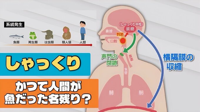 N6特集 “しゃっくり” は人間がかつて魚だった名残り?「横隔膜のけいれん」は間違いだった 見過ごせない重い病気のサインにも 2025年10月3日(金) 06:06 国内 子どもから大人、そして動物にも共通して起こる「しゃっくり」。身近な現象ですが、脳腫瘍や食道がんなど重い病気のサインとなっている可能性があります。人類の進化過程にも関わるしゃっくりの起源とメカニズムを…