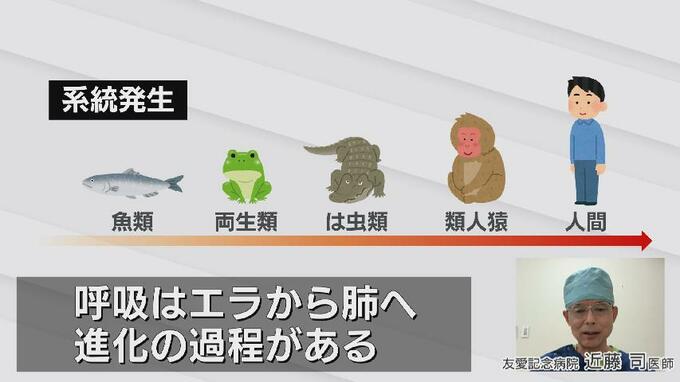 「系統発生といって、お魚からカエルになってトカゲになるみたいな(流れ)。水の中から陸上に上がって、呼吸はエラから肺へ進化の過程があるんです」