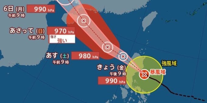 ▼5日午前9時には「強い」勢力に発達し、中心気圧は970hPaまで低下する見込みです。中心付近の最大風速は35m/s、最大瞬間風速は50m/sに達すると予測されています。