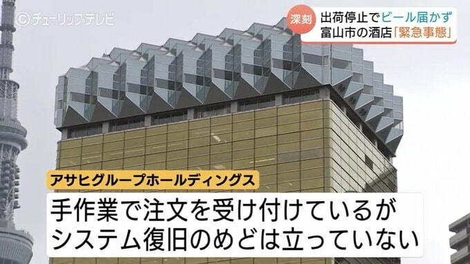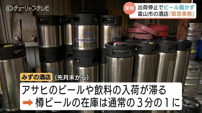 サイバー攻撃で発生した飲料大手アサヒグループのシステム障害。3日時点で復旧のめどは立っておらず、ビールなどの出荷に深刻な影響が出ています。富山市の酒店では樽ビールの入荷量が減り、在庫は通常の3分の1に。流通の先行きを不安視する声が上がっています。