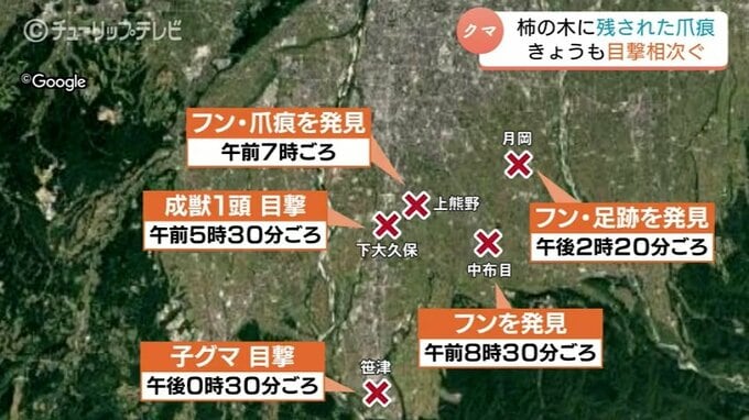 午前5時半ごろには、下大久保で成獣1頭が目撃情報が寄せられました。午前8時半ごろには中布目でクマのフンとみられるものが発見。さらに午後0時半ごろには笹津で子グマの目撃情報、午後2時20分ごろに月岡町で足跡・フンと見られるものが発見されました。