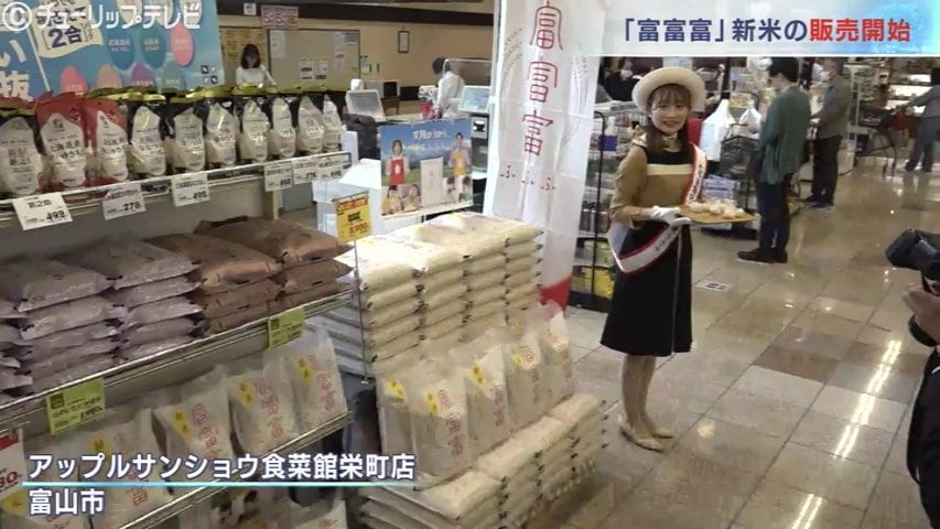 富山市のアップルサンショウ食菜館栄町店では、県産米「富富富」の新米が店頭に並び始め、きょうは、PR大使が試食販売を行いました。