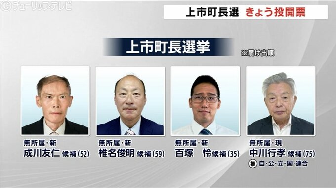 上市町長選には、届け出順に元町議で新人の成川友仁候補(52)、会社員で新人の椎名俊明候補(59)、元町議で新人の百塚怜候補(35)、現職の中川行孝候補(75)の4人が立候補。小中一貫義務教育学校の整備や、人口減少対策などを争点に5日間論戦を繰り広げました。投票は一部の投票所を除き午後8時までです。
