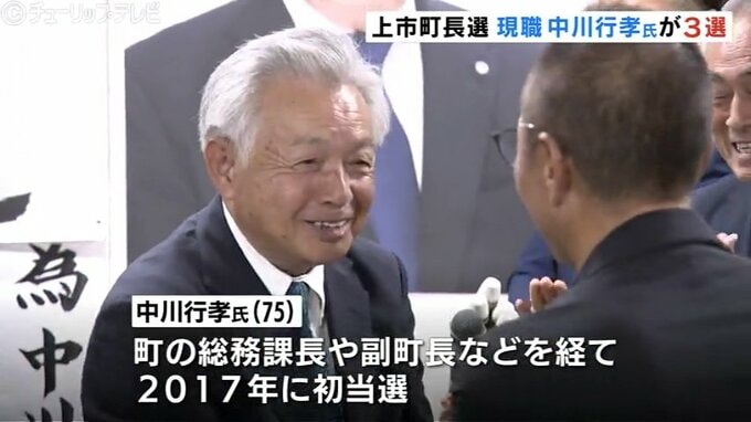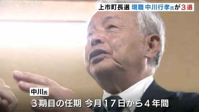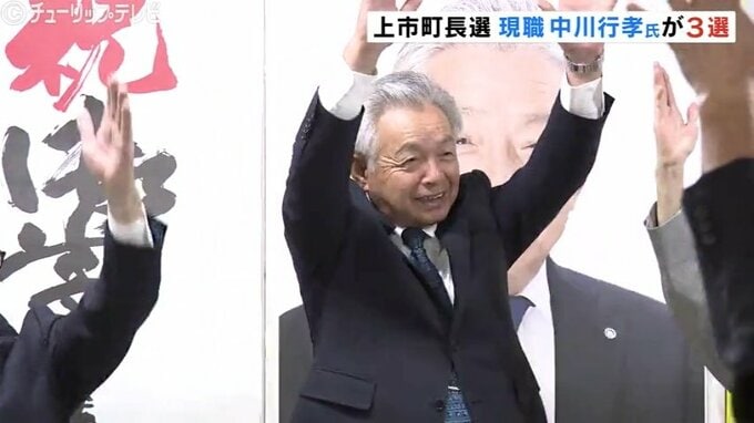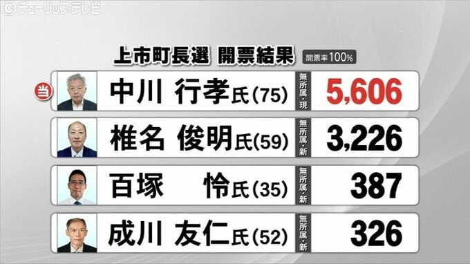 上市町長選挙は自民、公明、立憲民主、国民民主、連合富山などが推薦した現職の中川行孝氏(75)が5606票を獲得し、3期目の当選を果たしました。会社員で新人の椎名俊明氏(59)は3226票、元町議で看護師、新人の百塚怜氏(35)は387票、元上市町議で自営業、新人の成川友仁氏(52)は326票でした。