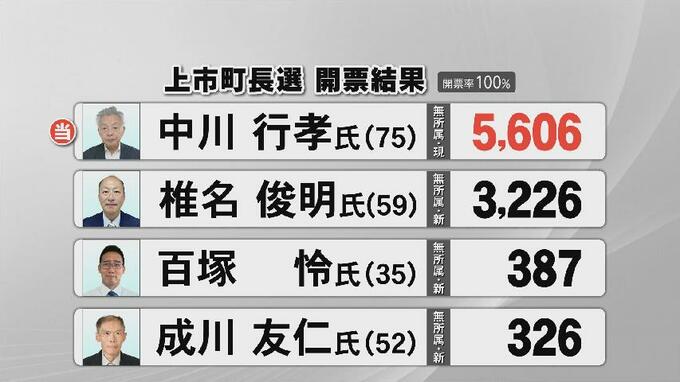上市町長選挙は自民、公明、立憲民主、国民民主、連合富山などが推薦した現職の中川行孝氏(75)が5606票を獲得し、会社員で新人の椎名俊明氏(59)に2380票差をつけて3期目の当選を果たしました。