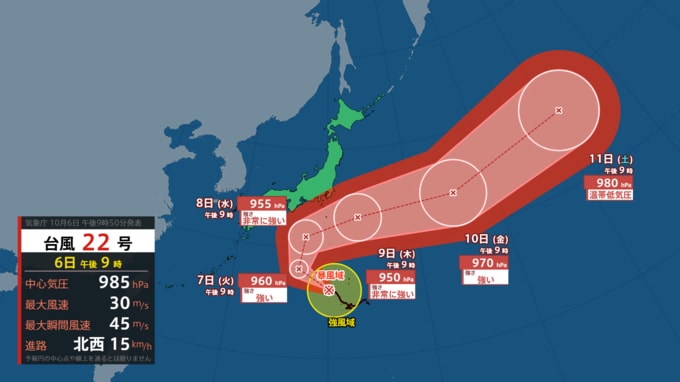 気象庁によりますと、台風22号は6日午後9時現在、父島の西南西約240キロの北緯26度05分、東経140度05分にあり、時速約15キロの速さで北西へ進んでいます。中心気圧は985ヘクトパスカル、中心付近の最大風速は30メートル、最大瞬間風速は45メートルとなっています。