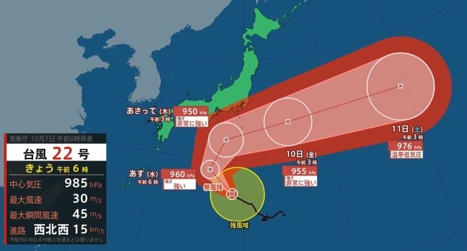 気象庁によりますと、台風22号は7日午前6時現在、日本の南を西北西に時速15kmで進んでいます。中心気圧は985hPa、中心付近の最大風速は30m/s、最大瞬間風速は45m/sとなっています。