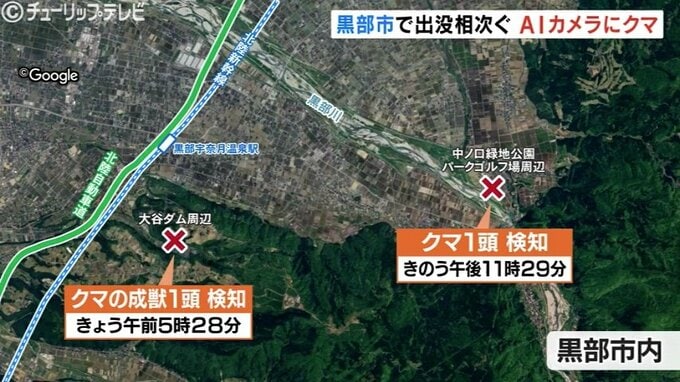 ニュースクリップ 深夜のパークゴルフ場にも…黒部市でクマ出没情報相次ぐ AIカメラが捉えた成獣の姿 市が警戒強化 富山」・黒部市 2025年10月7日(火) 12:39 国内 6日夜から7日朝にかけ、黒部市の山あいでAIカメラがクマを2件捉えました。いずれもAIカメラがその姿を確認したもので、黒部市などがパトロールを行い、住民に注意を呼びかけています。画像は黒部市前沢の林道に市…