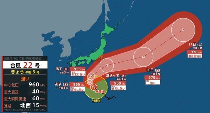 気象庁によりますと、台風22号は7日午後3時現在、日本の南を北西に時速15kmで進んでいます。中心気圧は960hPa、中心付近の最大風速は40m/s、最大瞬間風速は60m/sとなっています。