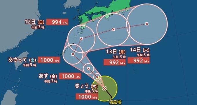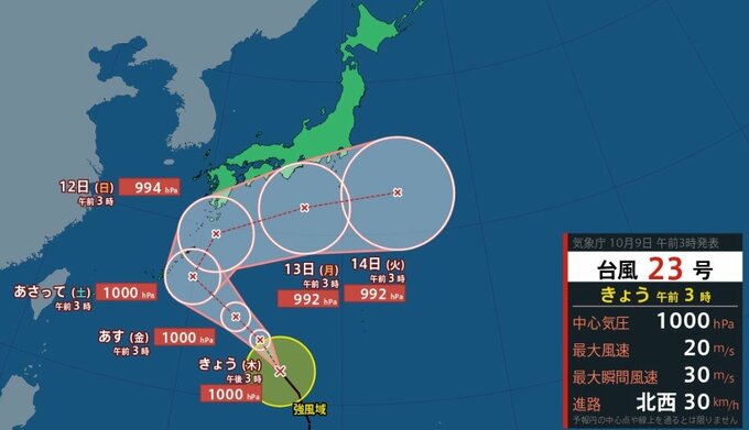 その後、日付が変わって9日午前3時、台風は日本の南の海上を時速30kmで北西に進んでいます。中心気圧は1000hPa、中心付近の最大風速は20m/s、最大瞬間風速は30m/sとなっています。強風域は全域で約220kmに広がっています。