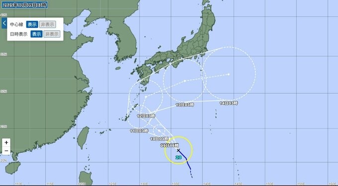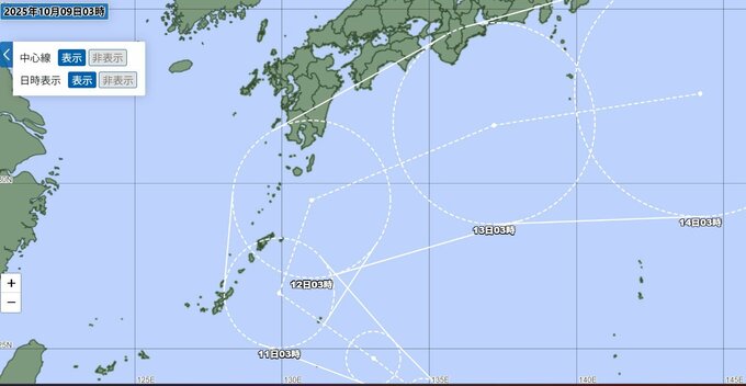 ▼ 13日以降は進路を東北東に変え、14日午前3時には日本の東の海上に抜ける見込みです。この時点での中心気圧は992hPa、中心付近の最大風速は25m/s、最大瞬間風速は35m/sと予想されています。