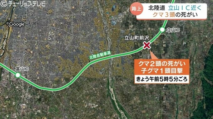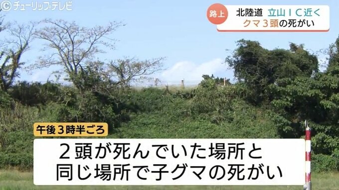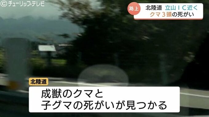 通報を受けた警察が現場に駆け付けたところ、立山町前沢の北陸自動車道上り線で成獣のクマ1頭と子グマ1頭の死がいが見つかったということです。