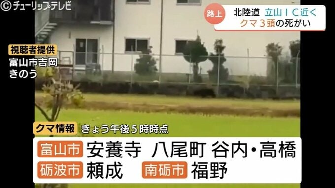 富山県内では9日もクマの目撃情報が相次ぎました。立山町では高速道路上であわせてクマ3頭の死骸が見つかりました。警察と町はパトロールを強化し周辺住民に警戒を呼び掛けています。