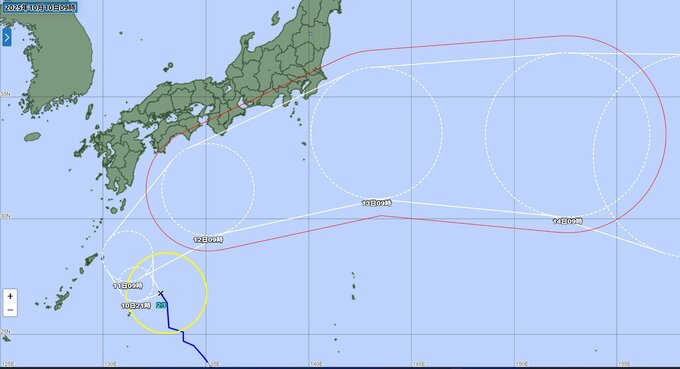 台風の予報進路は、予報の期間が長くなるほど誤差の幅(予報円)が大きくなります。最新の情報を確認するようにしてください。