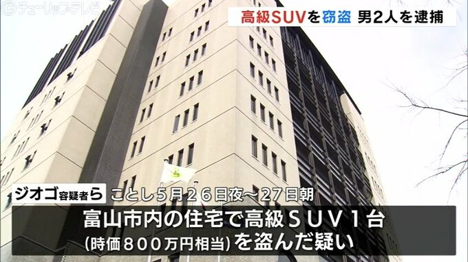 警察によりますと、2人はことし5月26日の夜から翌日の朝までの間、別の人物と共謀し、富山市内の住宅に停めてあった高級SUV1台を盗んだ疑い、ジオゴ容疑者は同じ時間帯に、射水市内の住宅で高級SUVを盗んだ疑いがもたれています。