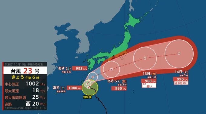 気象庁によりますと、台風23号は10日午後6時45分現在、中心気圧は1002hPa、中心付近の最大風速は18m/s、最大瞬間風速は25m/sとなっています。強風域は東側に220km、西側に165kmに広がっています。