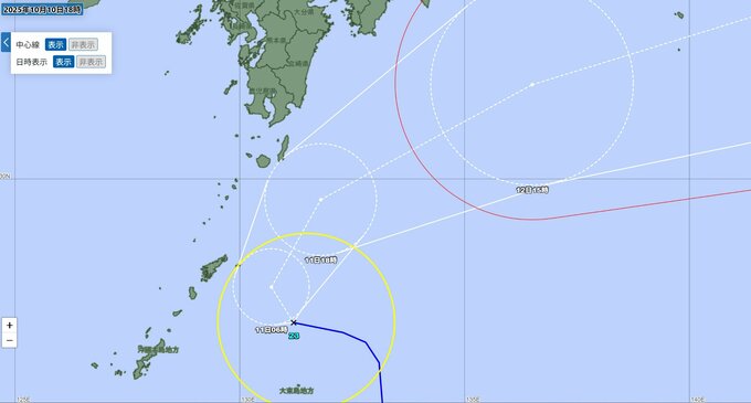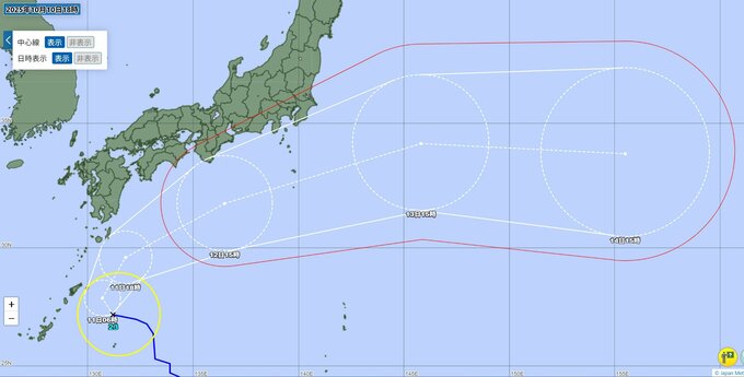 台風の予報進路は、予報の期間が長くなるほど誤差の幅(予報円)が大きくなります。最新の情報を確認するようにしてください。