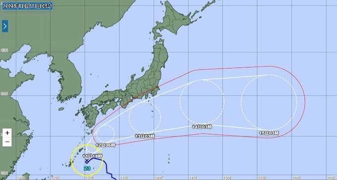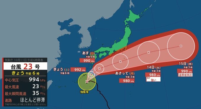 気象庁によりますと、台風23号は11日午前6時現在、奄美大島の南南東約180kmにあり、ほとんど停滞しています。中心気圧は994hPa、中心付近の最大風速は23m/s、最大瞬間風速は35m/sとなっています。強風域は全域で220kmに広がっています。