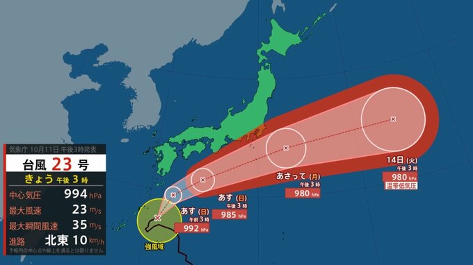 気象庁によりますと、台風23号は11日午後3時現在、中心気圧が994hPa、中心付近の最大風速は23m/s、最大瞬間風速は35m/sとなっています。強風域は南東側に220km、北西側に165km広がっています。