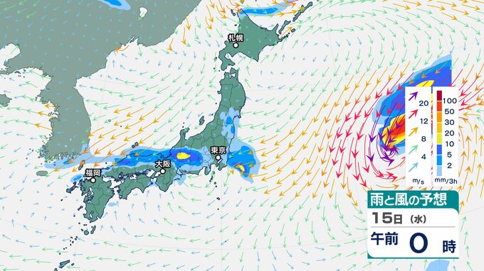 ニュースクリップ 【大雨情報】東北南部では12日夜遅くにかけて激しい雨が降り大雨となる所がある見込み 雨雲が予想以上に発達した場合は警報級の大雨となる可能性も…【雨と風のシミュレーション】 2025年10月12日(日) 09:54 国内 天気 15日(水)雨と風のシミュレーション