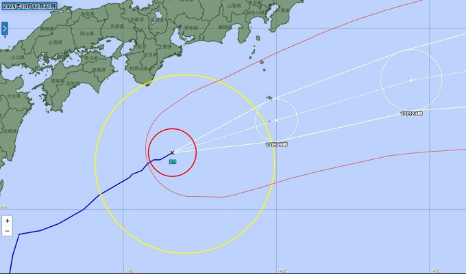 ▼13日午前9時には青ヶ島付近に達し、「強い」勢力に発達する見込みです。中心気圧は970hPaまで低下し、中心付近の最大風速は35m/s、最大瞬間風速は50m/sに達すると予測されています。